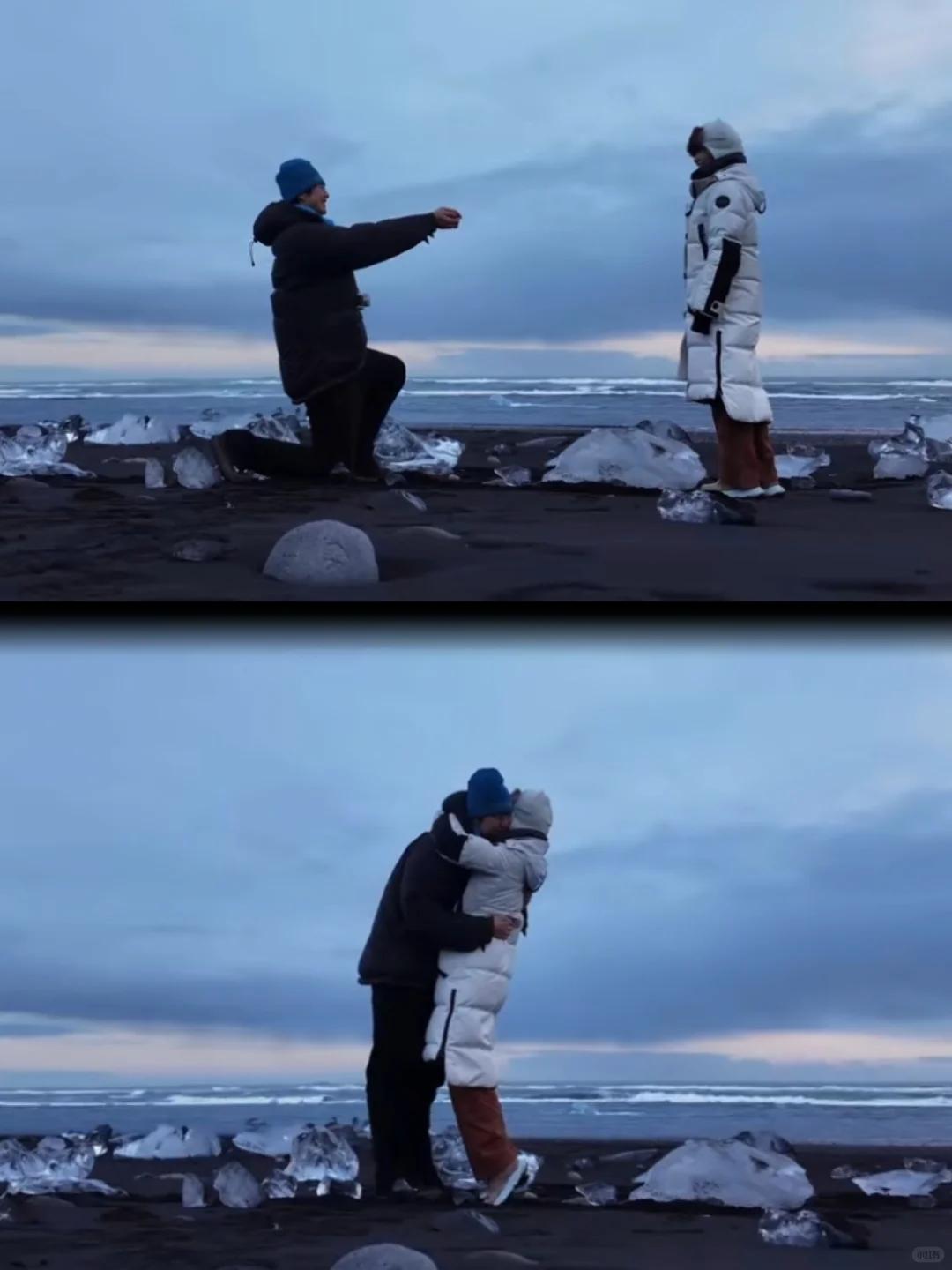冰岛的极光与黑沙滩美得像电影画面,周围的一切,都为这场浪漫见证,求婚成功后,他一把抱起金莎在浪花前拥吻,甜度超标了!