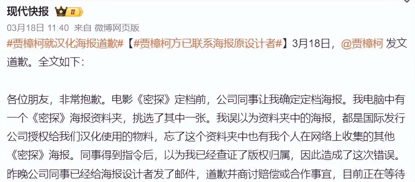 不久前,贾樟柯就刚刚经历了这么一遭,误发了未经授权的海报之后,才匆匆补了授权。