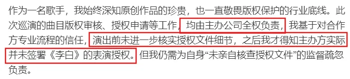 凌晨时,她发长文回应,承认自己在实际未获得书面授权的情况下,演唱了《李白》。