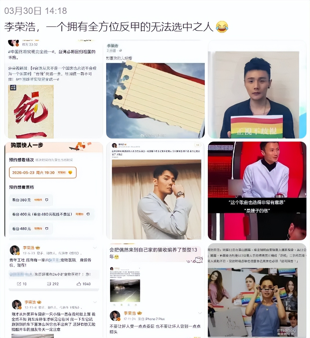 支持李荣浩的人,开始列他过往各种正面言行,夸他真性情、有原则、有底线。